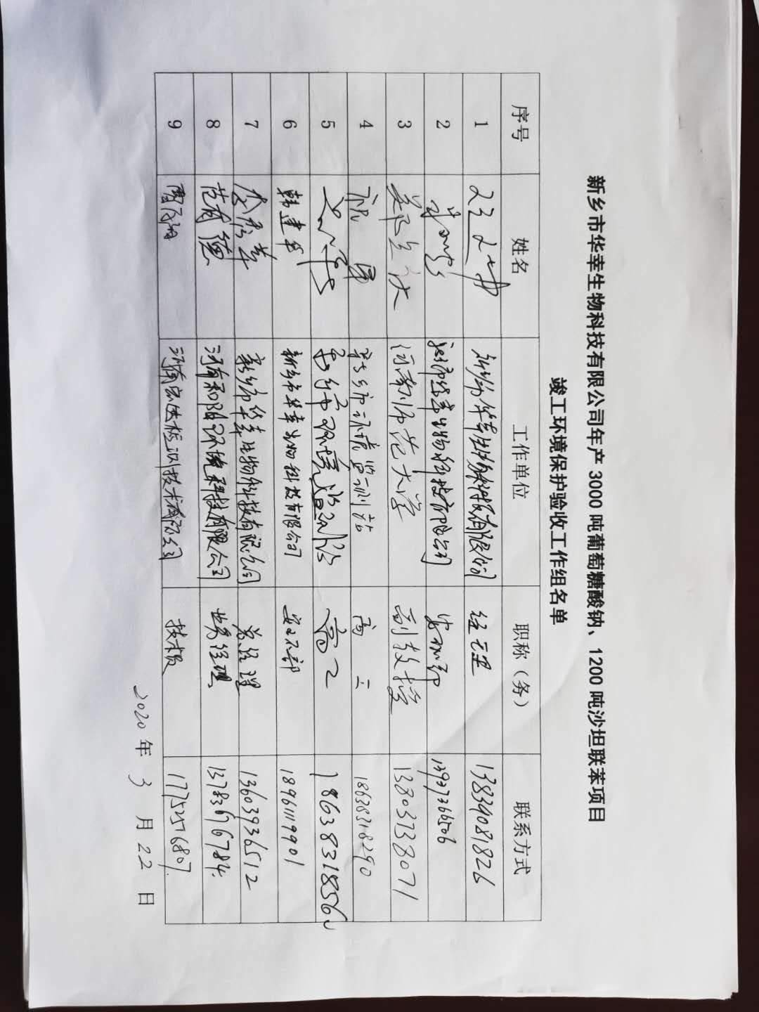 依据国务院第682号文颁布的新《建设项目环境保护管理条例》和原环境保护部国环规环评[2017]4号文公告的《建设项目竣工环境保护验收暂行办法》的相关要求,新乡市华幸生物科技有限公司于2020年1月20日在新乡市华幸生物科技有限公司厂区召开会议,对新乡市华幸生物科技有限公司年产30000吨葡萄糖酸钠、1200吨沙坦联苯项目进行竣工环境保护验收。会议成立了验收工作组,成员由建设单位新乡市华幸生物科技有限公司、验收检测单位河南和阳环境科技有限公司、河南宏达检测技术有限公司的代表及邀请的技术**组成(验收工作组名单附后)。会前,验收工作组成员对工程主要生产设施、环保设施进行了现场检查,会议听取了建设单位关于项目建设情况及竣工环保工作的情况介绍、竣工环保验收监测报告编制单位关于验收监测工作技术汇报,查阅了竣工环保验收监测报告,核实了有关资料。经过认真审议与讨论,形成如下验收意见: